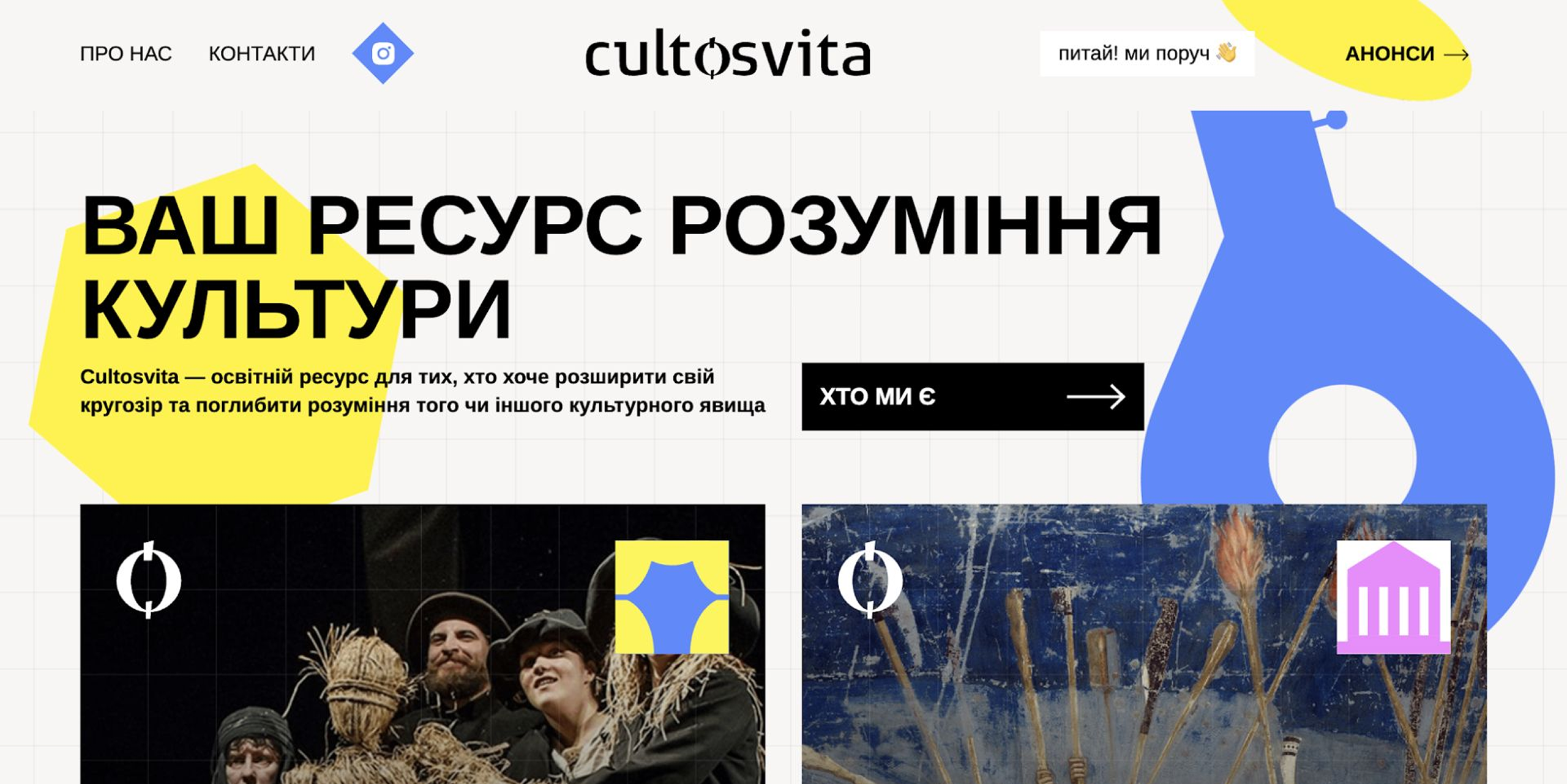 Також запустили новий проєкт Cultosvita — ресурс, що заглиблює в культурні контексти сучасної України та створює освітні продукти, присвячені дослідженню культурних явищ у різних сферах та напрямах.